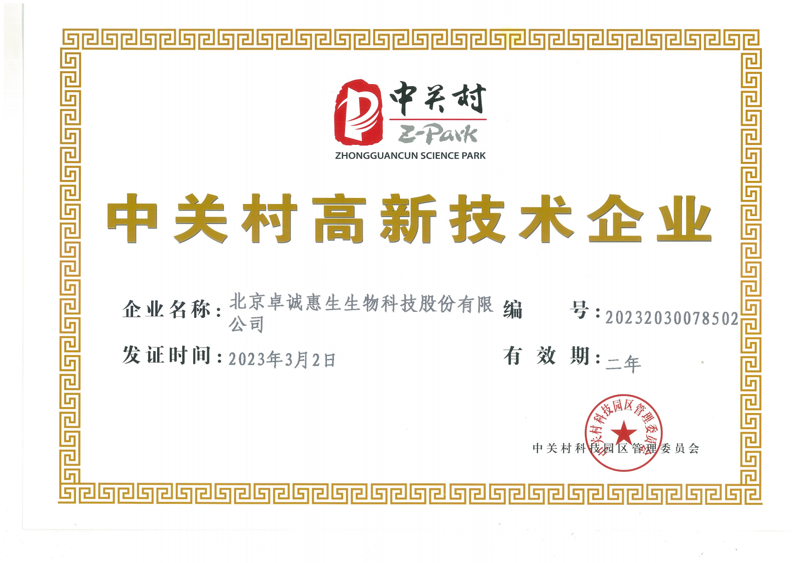 - 中關村高新技術企業證書